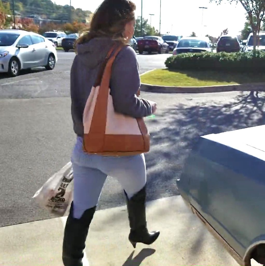 So they’re now back at the previous store with Jane doing some business at the counter while Veronica just hangs around filming Jane’s boots and her feet in flip flops. Trying to be inconspicuous while filming. Jane does some boot heel tapping while she waits. She’s handed the parts and the girls leave…again.