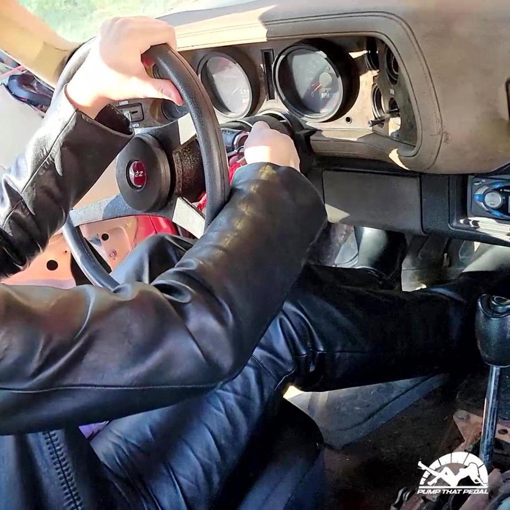 Jane Domino Hard Starts & Revs the Bug Barefoot Over Shoulder View