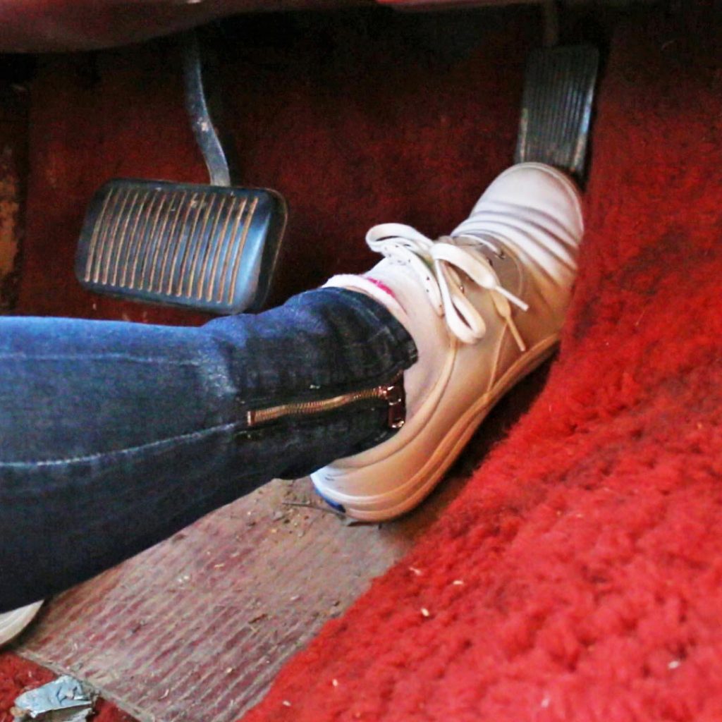 Rose Pedal Cranking the Toyota Celica in Open Toe Sandals