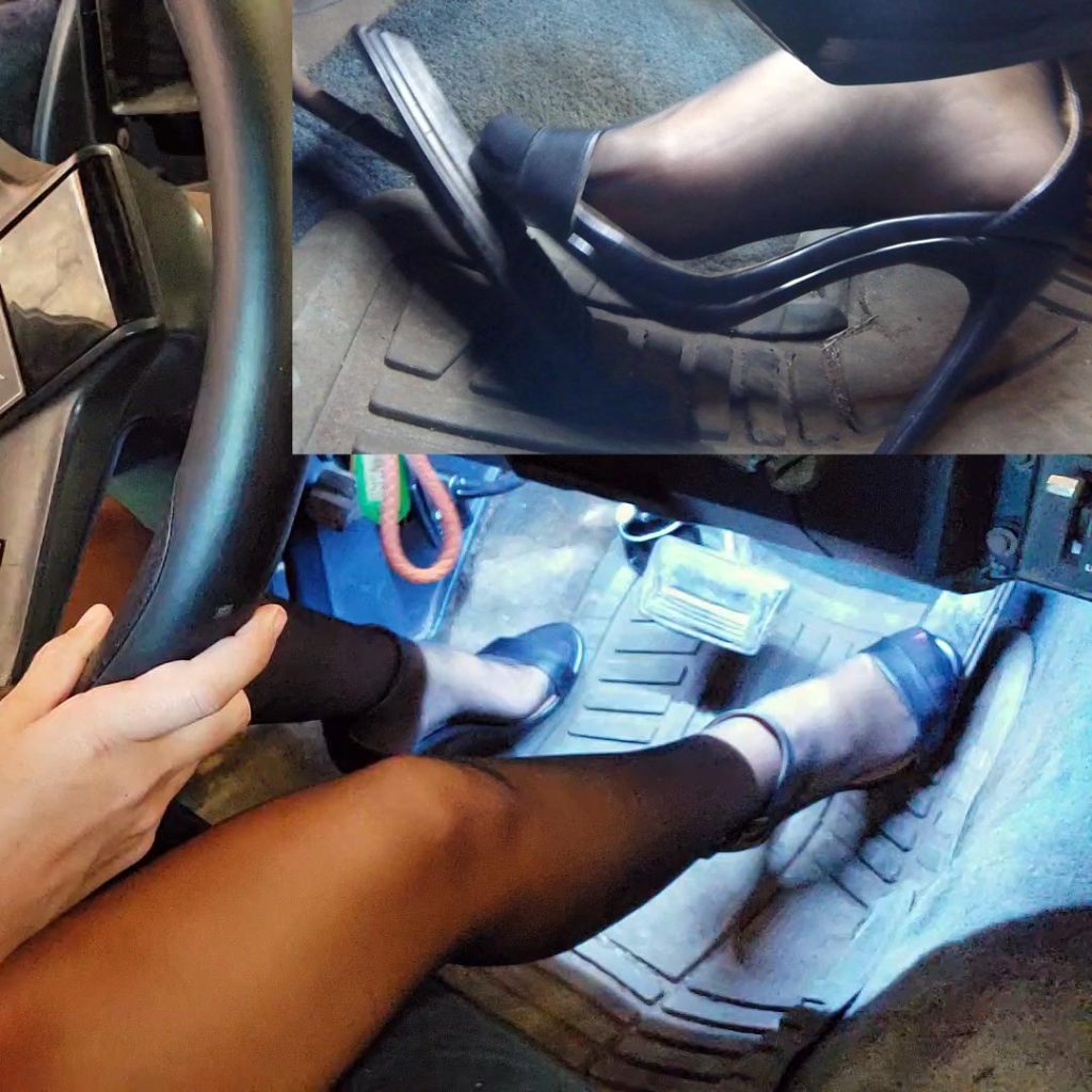 Jane Domino Bug Drivin’ in Tight Jeans, Pantyhose & Beige Strappy Stilettos