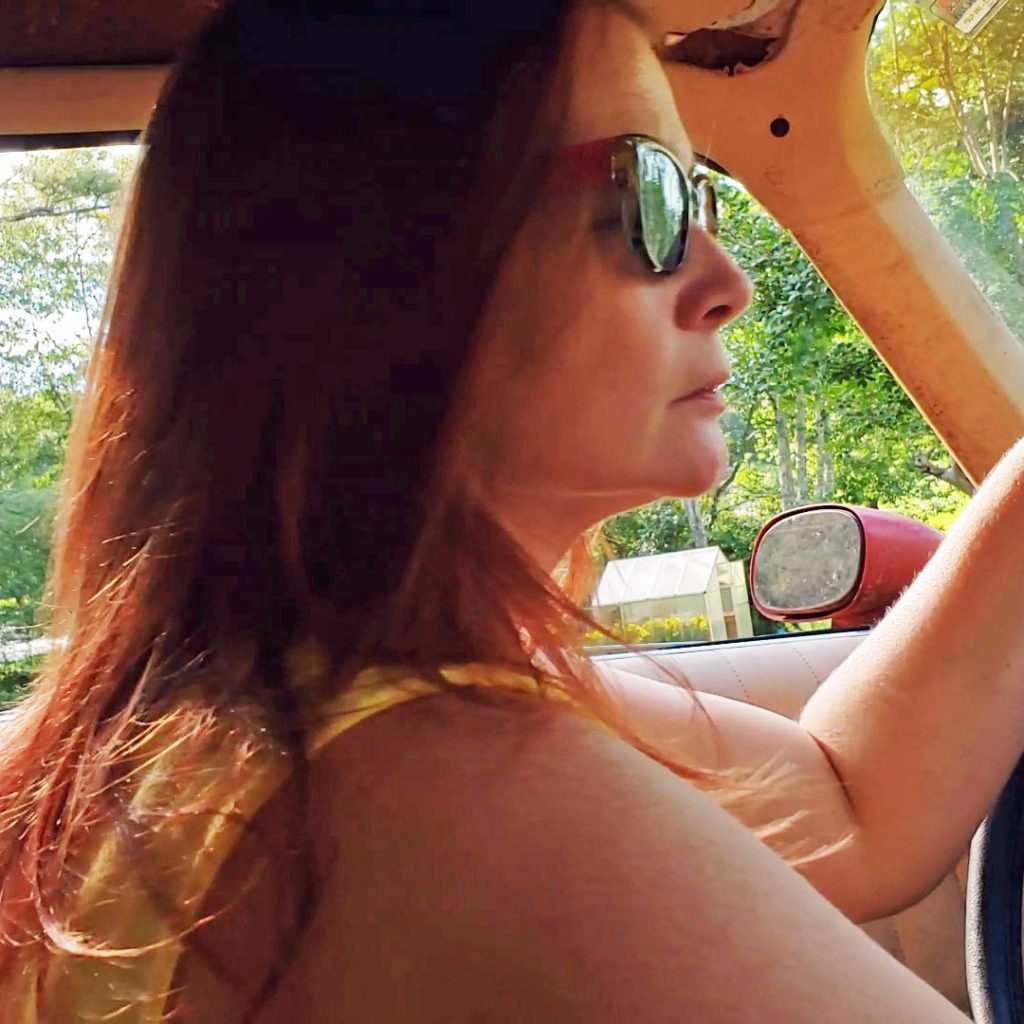 “Gimmie the keys. I don’t have the keys.” she demands of me while standing on the stairs. I give her the keys and she walks around to the drivers side and gets in. I film her cranking up the old car from the opens drivers door. She gets it started after a few tries, gives it a few revs and backs up.