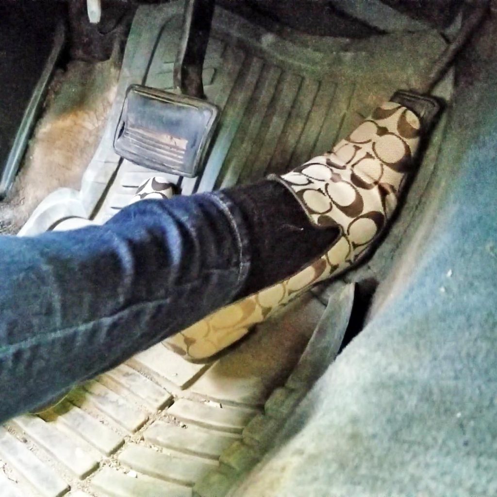 Vivian is wearing a purple button down blouse, dark denim jeans, black socks, white loafers w/ white circles w/ black around the circles, there’s cars going by no one pulls over to offer to help her get her car to start backup. Shish is shooting a mixture of upper and footwell video as Vivian’s sexy size 6 right foot gives the gas pedal a really good workout, he also points the camera at the rear window showing cars going by he also shoots video through the windshield towards the end of the video after she gets the engine started and back on the road.