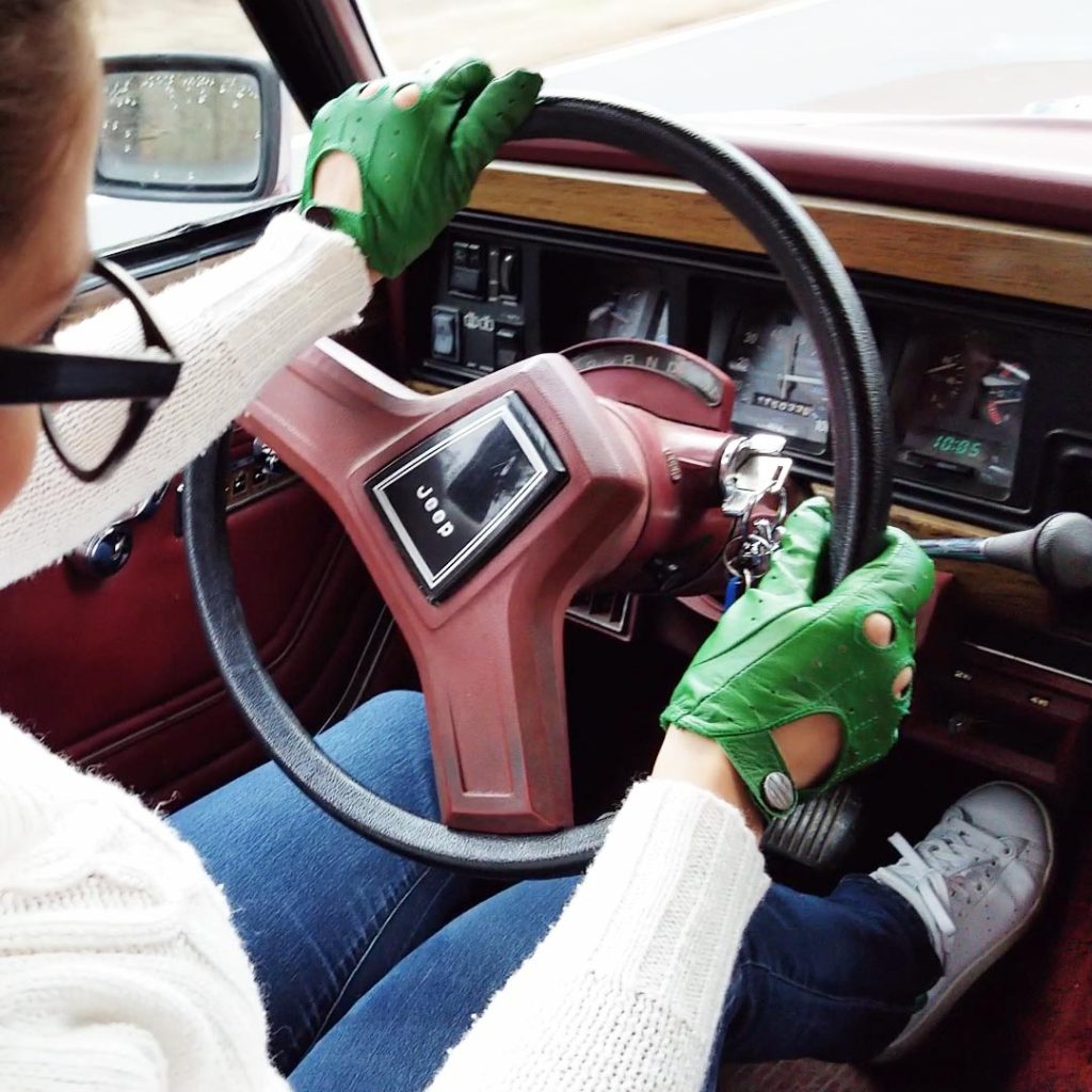 The jeep has been giving Vivian a little bit of trouble on the side of a road near a stop sign the engine dies on her she had to crank and work the gas pedal some to get the engine to start backup. Vivian is wearing black rim glasses, white V-neck hoodie sweater, green leather driving gloves, denim jeans, gray socks, white leather Adidas sneakers w/ green trim around the heel.
