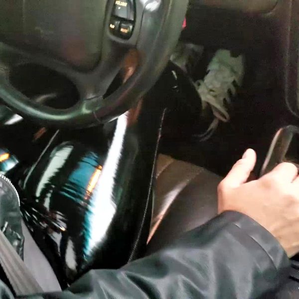 Jane Domino Driving 2001 Camaro SS Black Vinyl Pants & Adidas Sneakers, 1 of 2