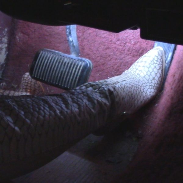 Jane hops in the old Camaro while filming from her POV. She's wearing tight jeans and these white croc-textured slip-on… Read more