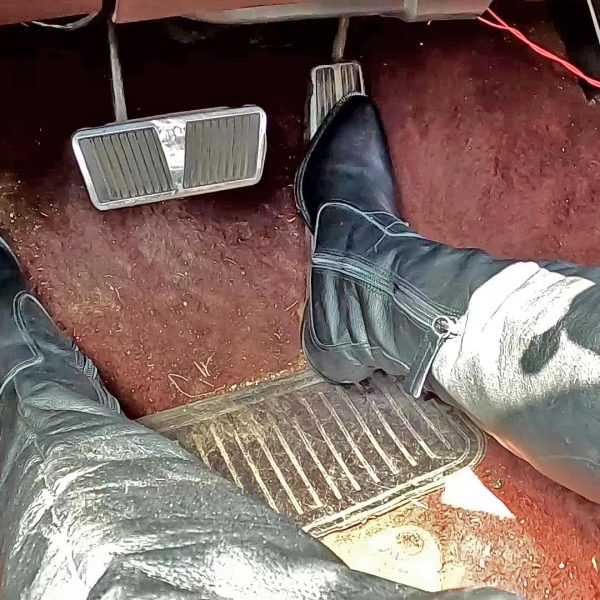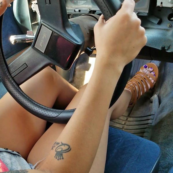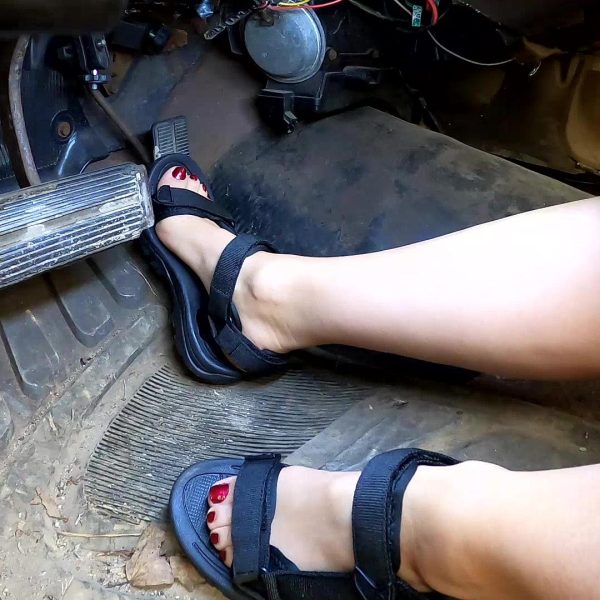She cranks, revs and drives the Monte Carlo first then the Volvo in these strappy leather sandals and purple nails.… Read more