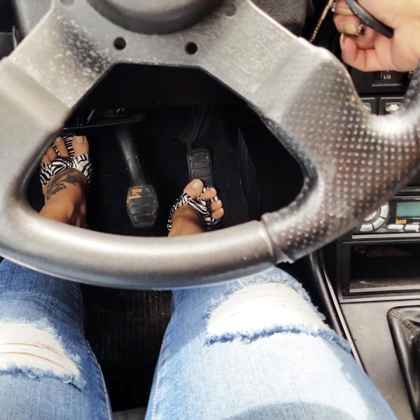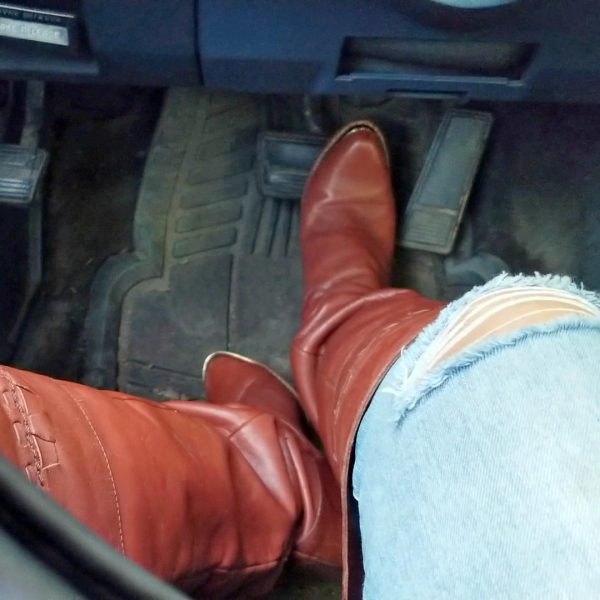 She gets in and takes off her red leather knee high boots and gray socks before touching the pedals. She's… Read more