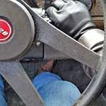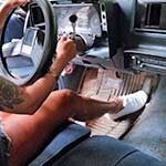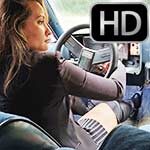 Daisy Driving the Jeep Barefoot & Stretching to Reach Pedal